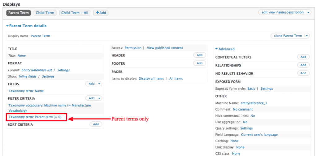 2. Create an entity reference view with 3 blocks for created vocabulary Parent term, Child term, Child term – All.