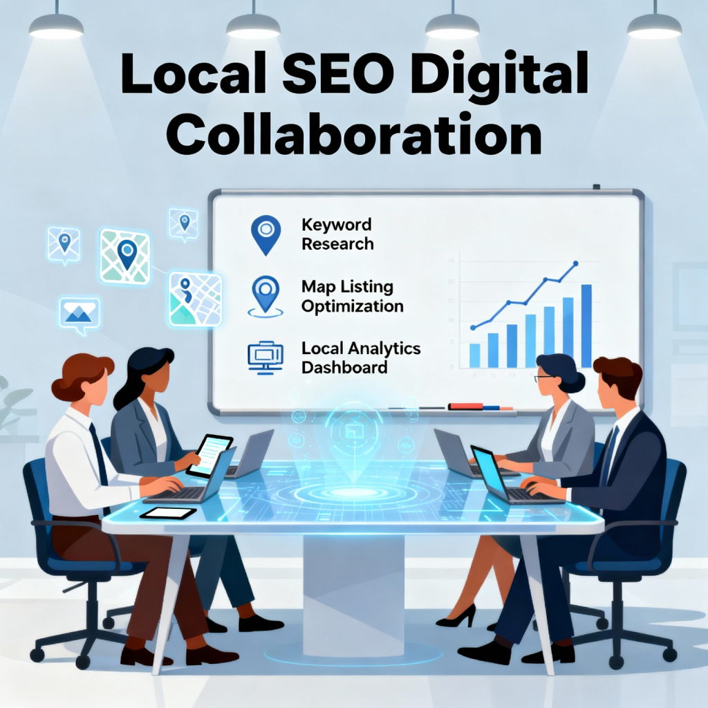 Business team collaborating on local SEO digitally