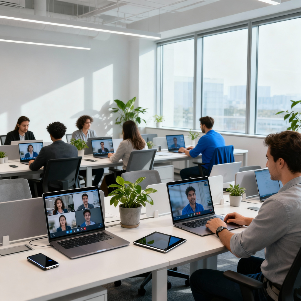 Modern hybrid work office with remote employees on video calls