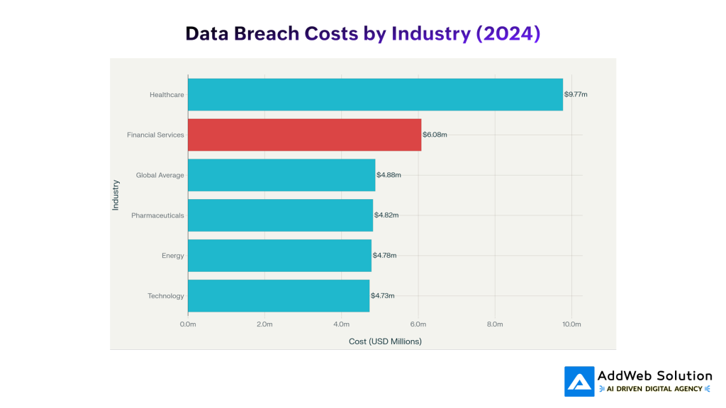Comparison of average data breach costs across industries, highlighting that financial services face significantly higher costs than the global average