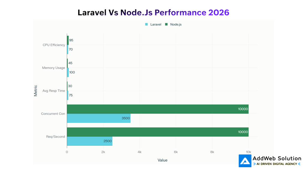 Node.js crushes in this field, with 10,000+ requests per second, whereas Laravel can generally handle 2,000-3,000 RPS. So, that is roughly a 5x difference, which matters when you are paying cloud bills per server instance.