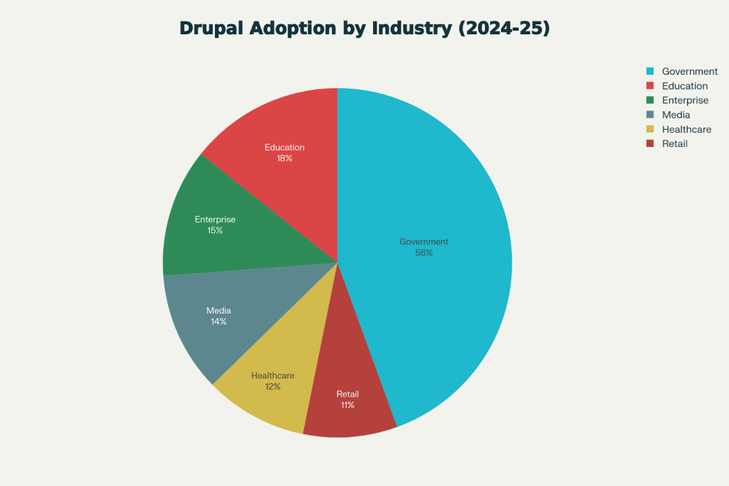 - 56% of global government websites use Drupal, making it the top choice for public sector digital services