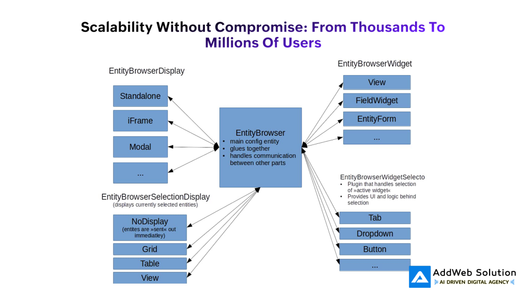 Drupal Entity Browser architecture diagram showing component interactions for entity selection and display