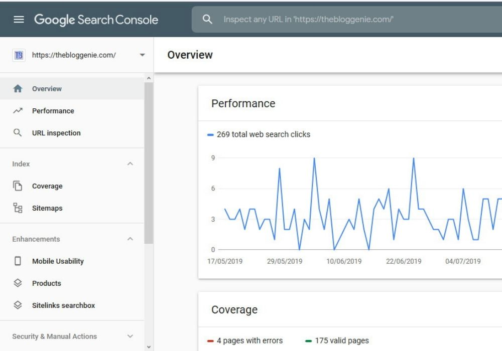 Google Search Console overview dashboard showing web search clicks performance and page coverage for a website