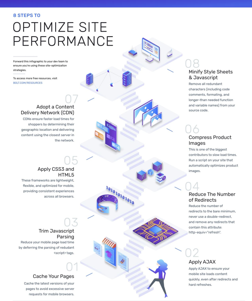 Infographic showing 8 steps to optimize website performance, including caching, AJAX, script trimming, and content delivery networks