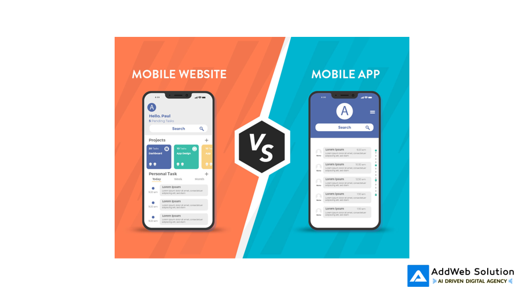 Comparison of mobile website and mobile app interfaces on smartphones, highlighting user experience differences