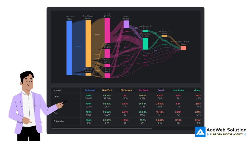 User journey analytics dashboard illustrating traffic flow and product performance at various stages