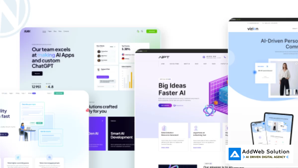 Examples of AI-powered website themes and dashboards highlighting personalization and smart features for upcoming WordPress development