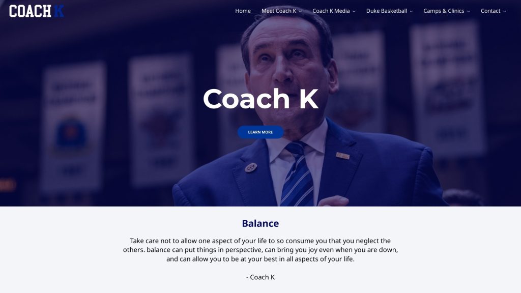 Coach K, the legendary college basketball coach, uses WordPress to create a strong digital presence and connect with a broad audience. His site showcases his coaching philosophy, leadership values, and career milestones in a clean, user-friendly design. WordPress enables him to share inspiration, insights, and resources with athletes, fans, and future coaches.