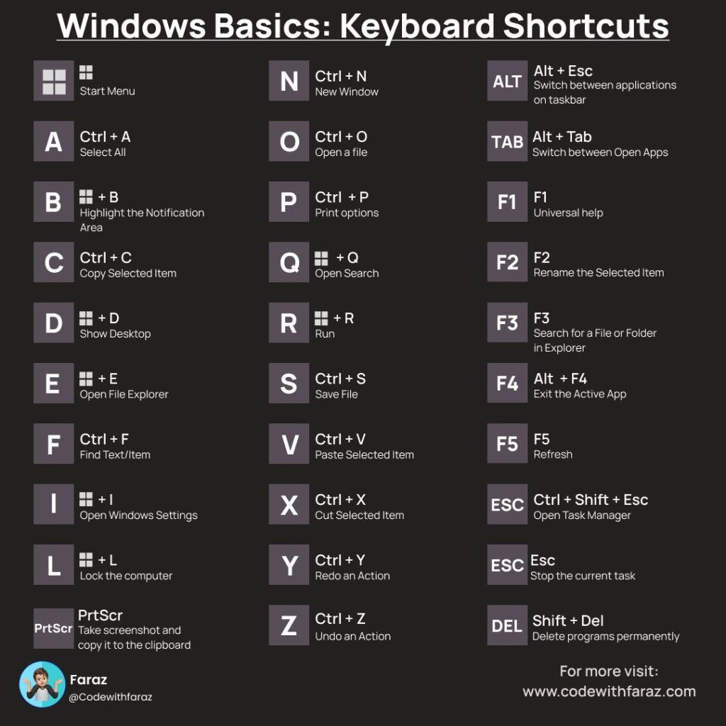 Comprehensive infographic of Windows keyboard shortcuts for efficient navigation and editing tasks