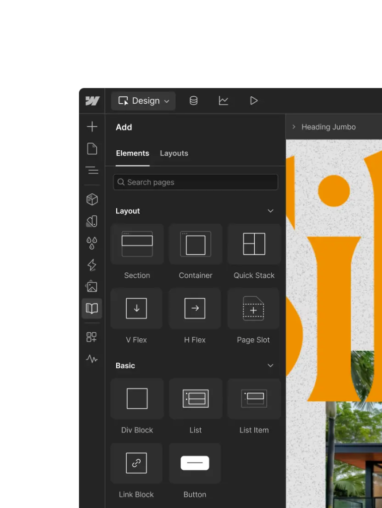 Webflow’s design interface showing layout and basic elements available for building web pages